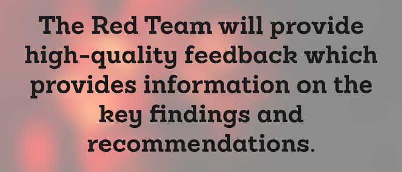At the completion of the engagement, the Red Team will provide high-quality feedback which provides information on the key findings and recommendations that they have been able to establish.